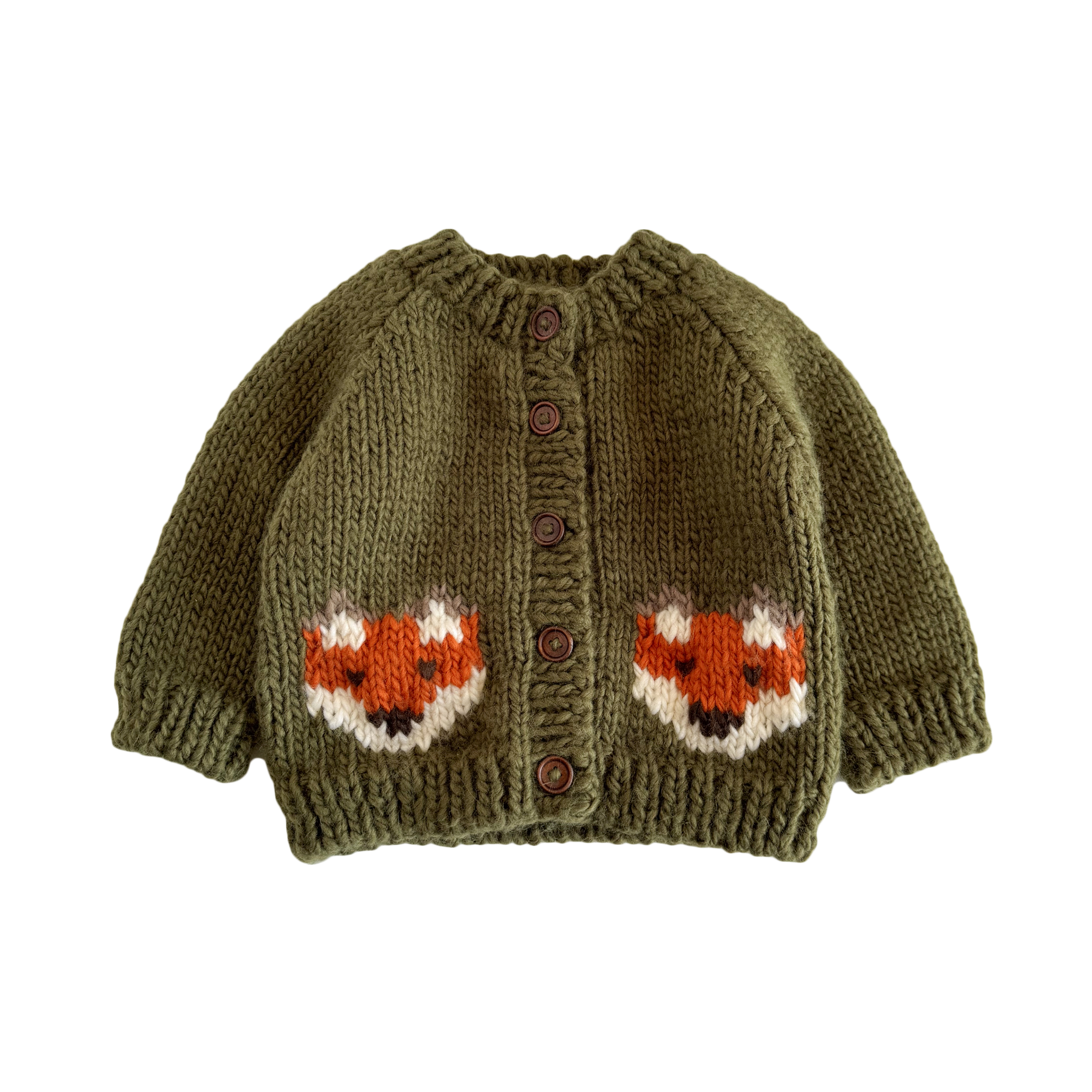 Our Fox Cardigan brings a touch of woodland charm to your little one's wardrobe. The green cardigan features two knit-in foxes in the front. With its classic button-front design and ribbed trim, the moss hue of the forest create a whimsical and stylish outfit. Match with our Fox Hat Beanie.