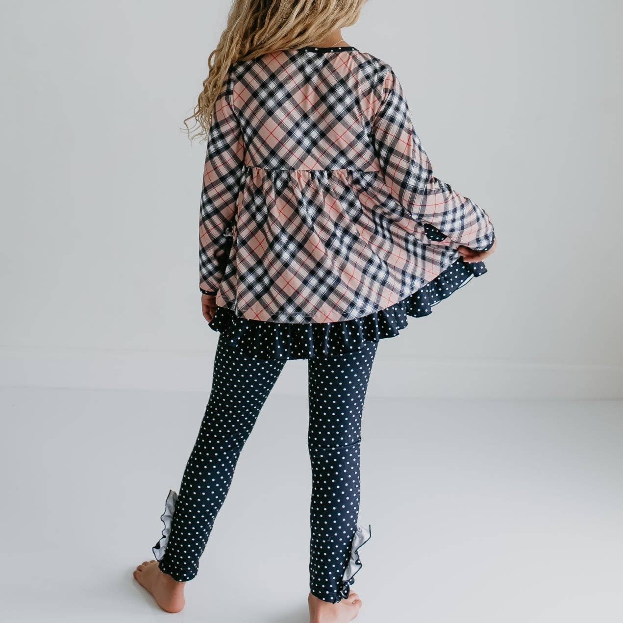 Get ready for some serious style with this Tan Plaid Button Set! Perfect for the fashion-forward girl, this set includes a trendy tan plaid shirt and matching buttons. Polka dot leggings with ruffle button accents. Perfect for back to school in the fall and winter. 95% Polyester, 5% Spandex