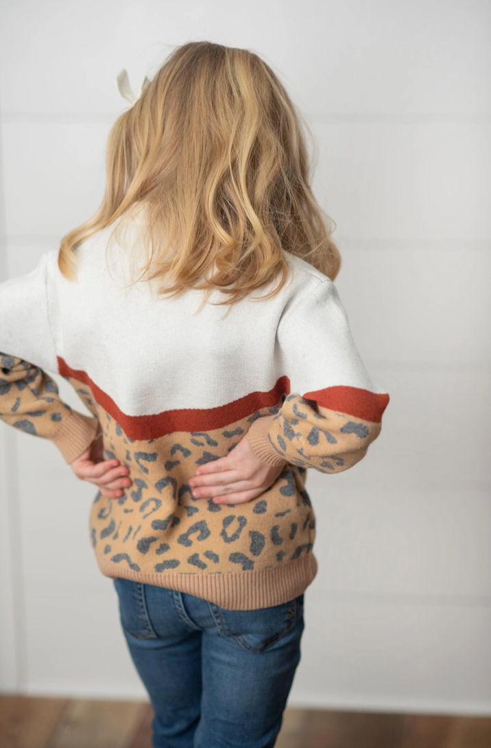 Girls pullover crew neck sweater with unique leopard, cream, and rust V color block print. Perfect for back to school in the Fall!