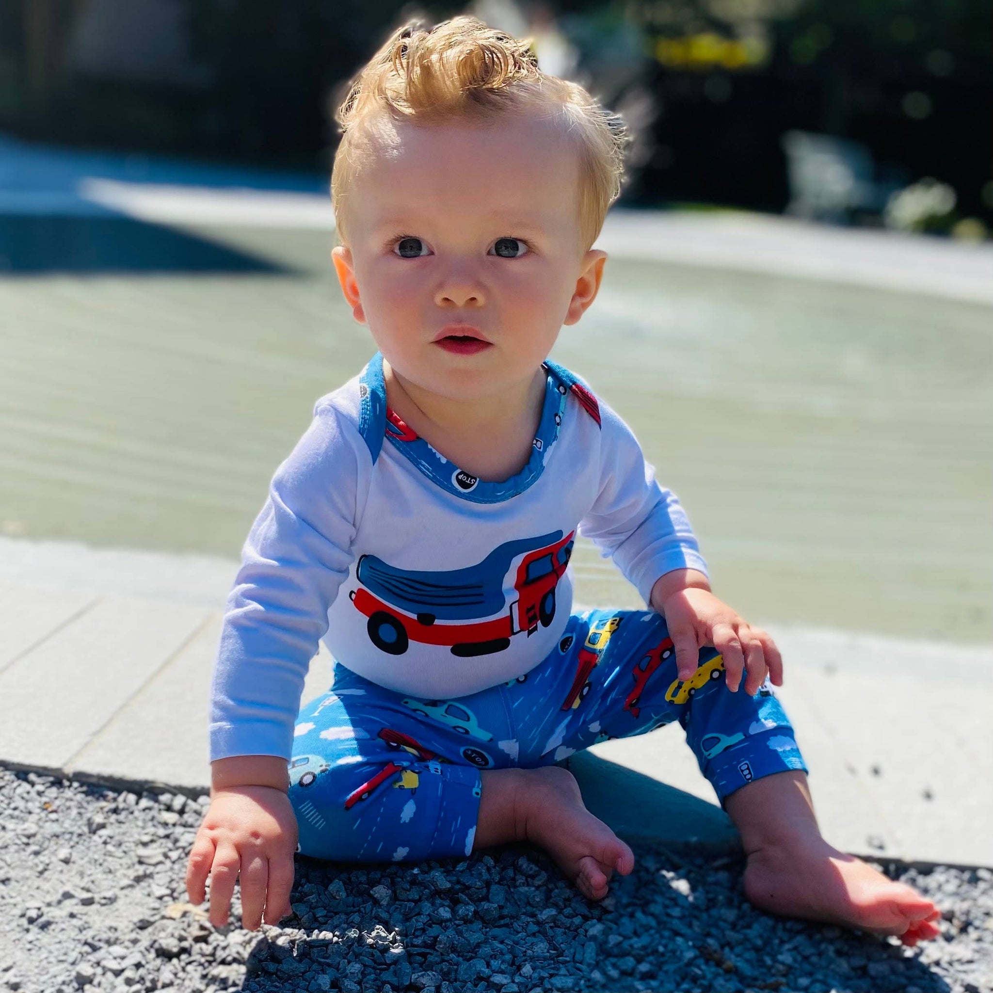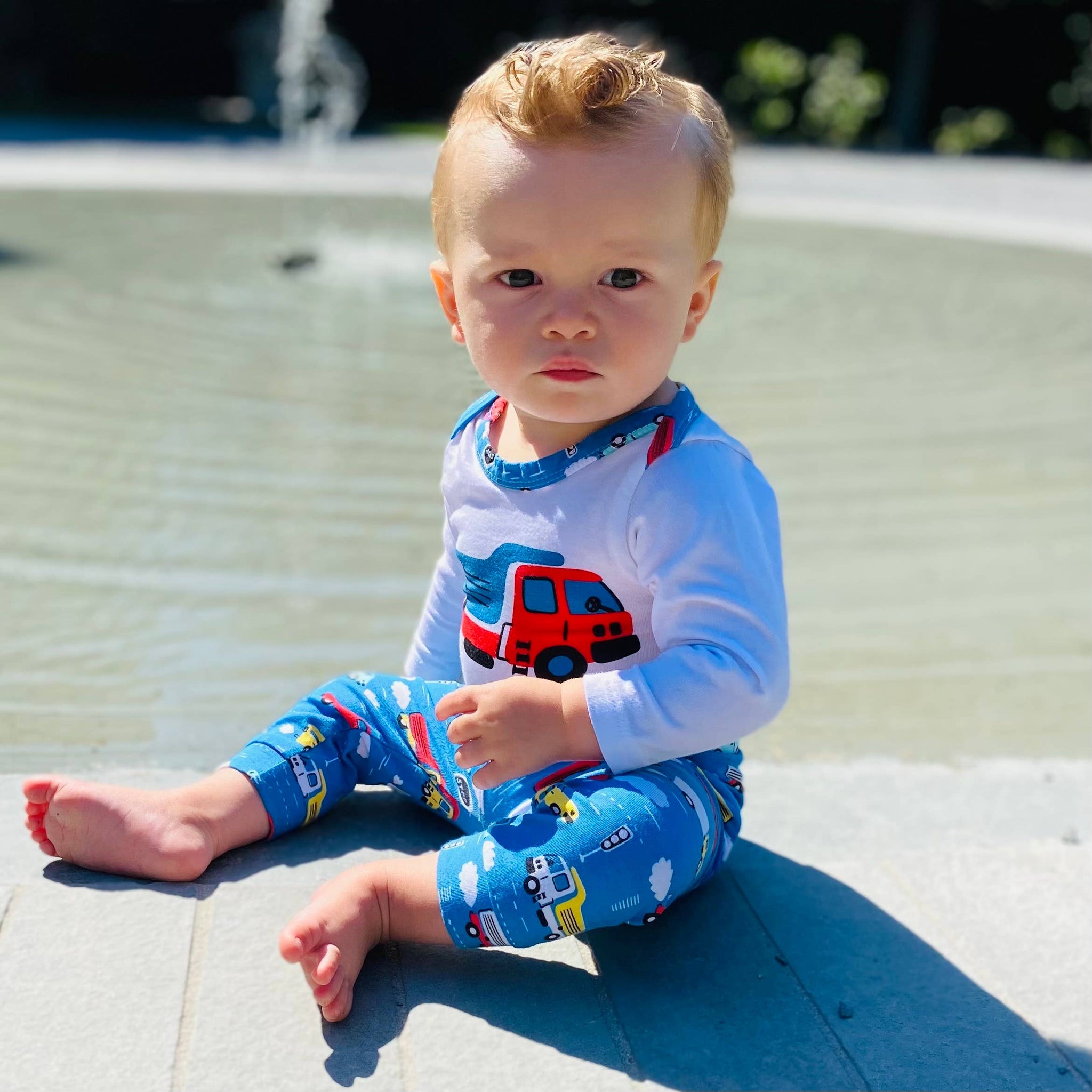 The top features an adorable Truck silk screen applique. The fabric is an original AnnLoren design.
