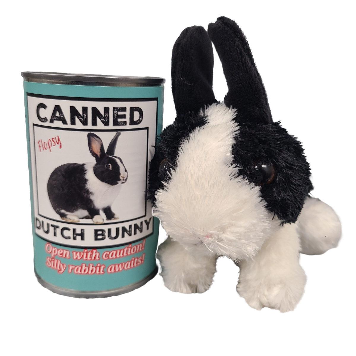 About this can: Meet Flopsy the Canned Dutch Bunny! Included is 1 plush dutch bunny sealed in a soup can. Your choice of lid style: standard, pop, or foil. Plush measures approx. 6 inches Funny bunny jokes and interesting facts on the can Recycled plush: Made from recycled plastic water bottles Designed and canned in the USA. Can and label made in USA. Plush made in China. 100% recyclable packaging Our cans are loved by all, children and adults alike. Few people can say they've received a Canned Dutch Bunny before!