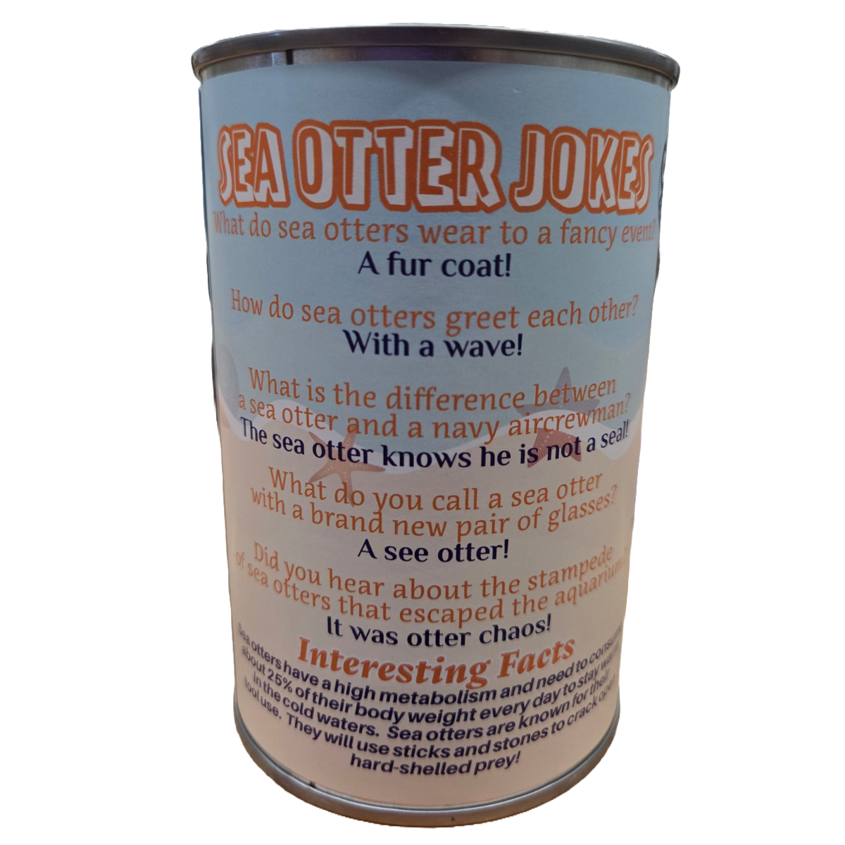• Funny sea otter jokes and interesting facts on the can.