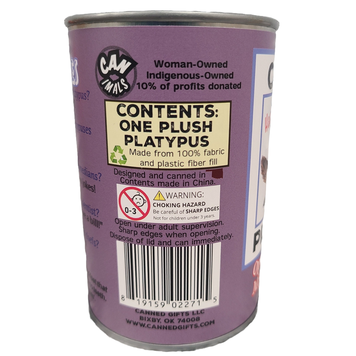 • Plush measures approx. 5 inches. • Funny platypus jokes and interesting facts on the can. • Designed and canned in the USA. Label made in USA. Platypus made in China.