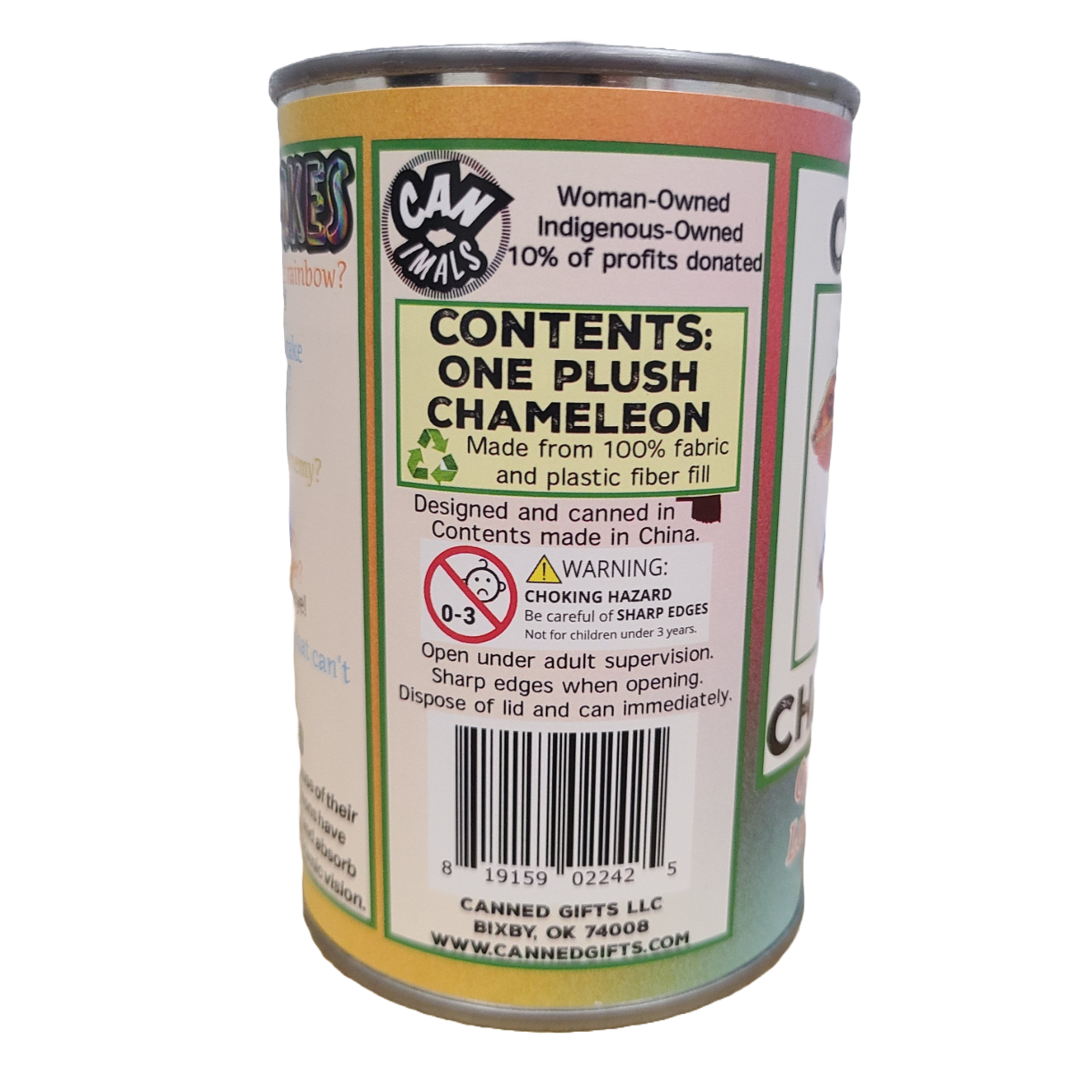 Meet Kiwi, our Canned Chameleon! About this can: Included is 1 plush chameleon sealed in a can. Use a can opener to open the fun gift or choose a pop top lid Plush measures approx. 5 inches long Funny chameleon jokes and an interesting fact on the can Designed and canned in the USA. Can and label made in USA. Plush made in China. 100% recyclable packaging Our cans are loved by all, children and adults alike. Few people can say they've received a Canned Chameleon before!