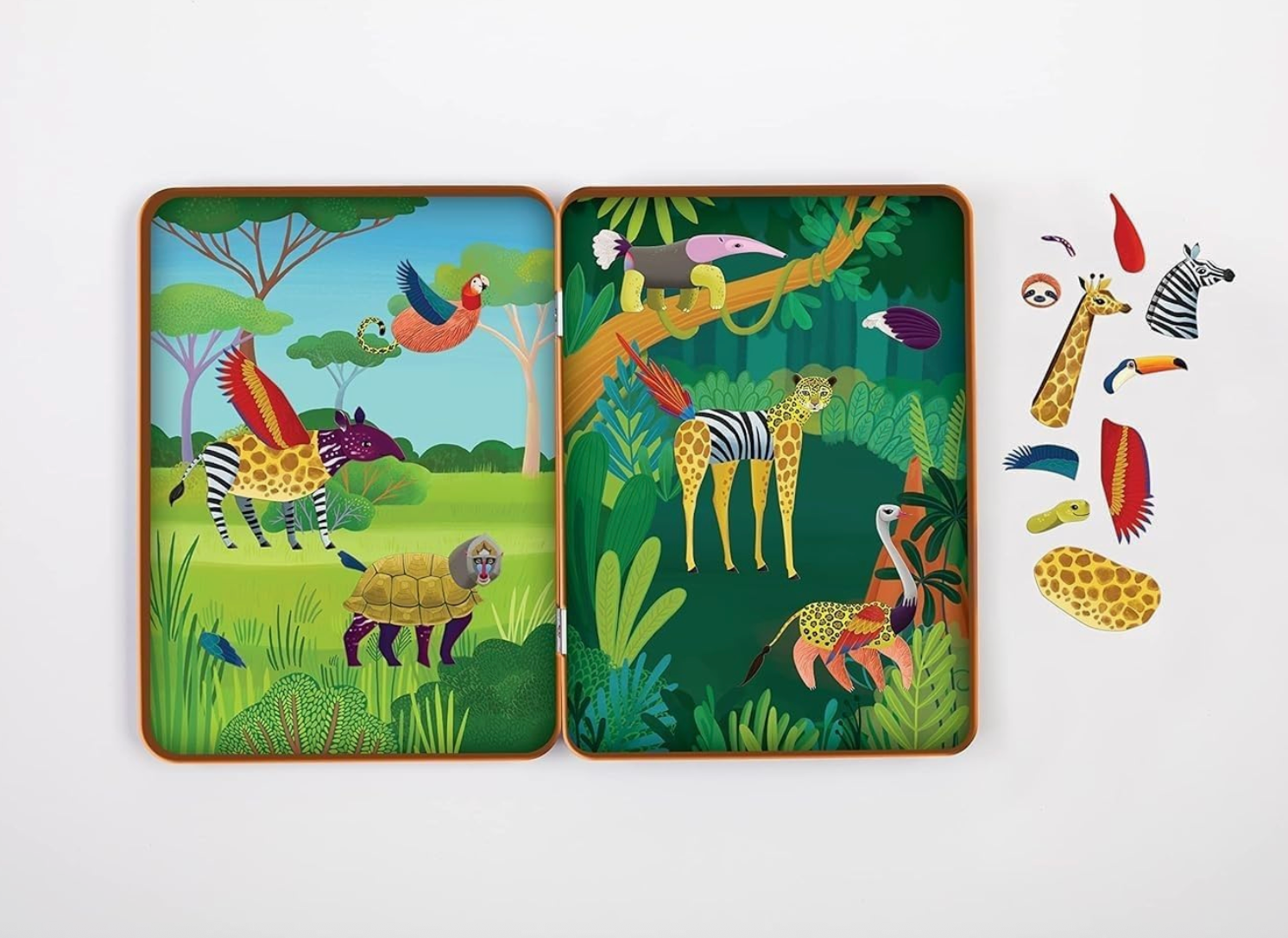Mudpuppy's Wild Mix-Up Magnetic Build-it includes 2 illustrated scenes and 3 sheets of mix and match magnets for creating your own wild animals! The sturdy tin package offers hours of imaginative play with easy cleanup and storage of pieces. Mudpuppy's Magnetic Tins are the perfect children's travel toy and quiet time activity.