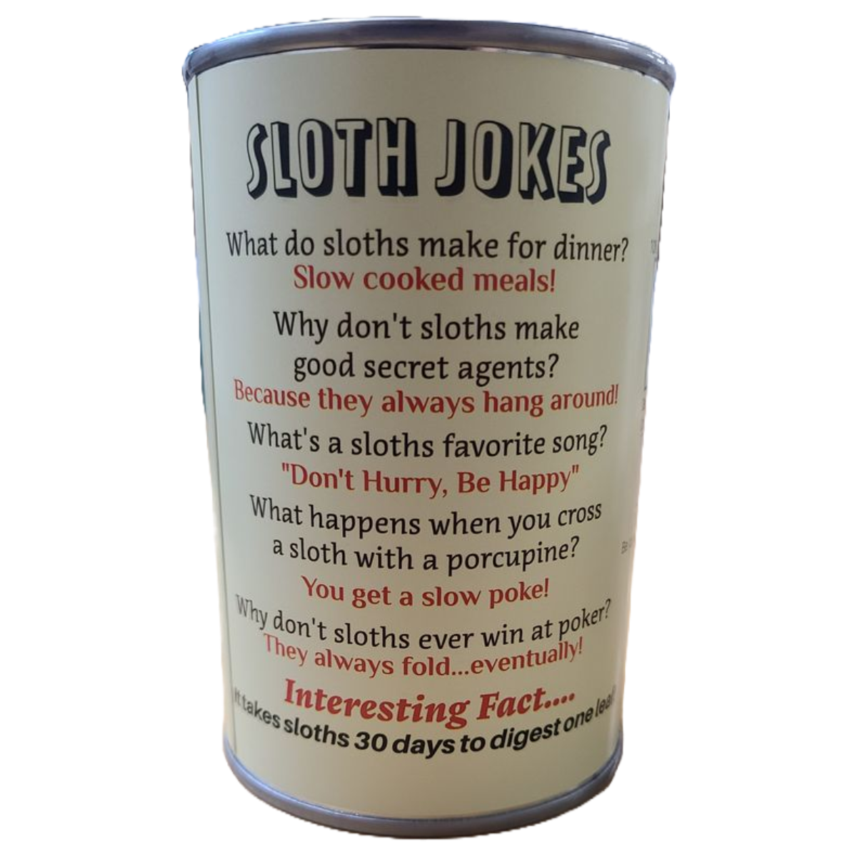Meet Twiggy the Canned Sloth! These are super fun and popular with gift shops and novelty and boutique shops! • Sloth plush sealed in a soup can. Use a can opener to open the fun gift or choose a pop top lid! • Plush measures approx. 5 inches each. • Funny sloth jokes and an interesting fact on the can. • Designed and canned in the USA. Can and label made in USA. Plush made in Indonesia.